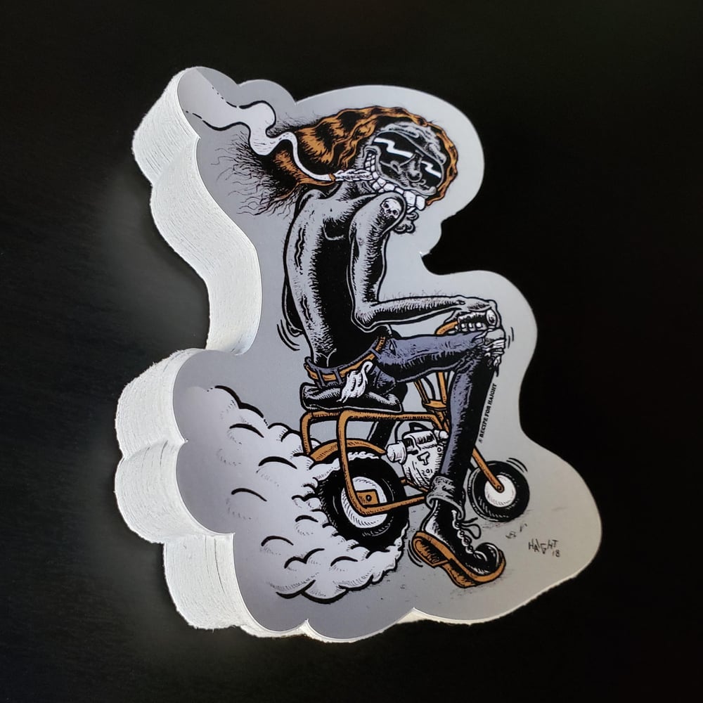 Check out this sweet burnout doing a burnout on a mini-bike! "Double Burnout" is a diecut sticker measuring approximately 3" wide by 4" tall. Might do some shirts with this illustration at some point since I've had some requests, but for now, enjoy the sticker...or don't! ha. Thanks fer lookin'!