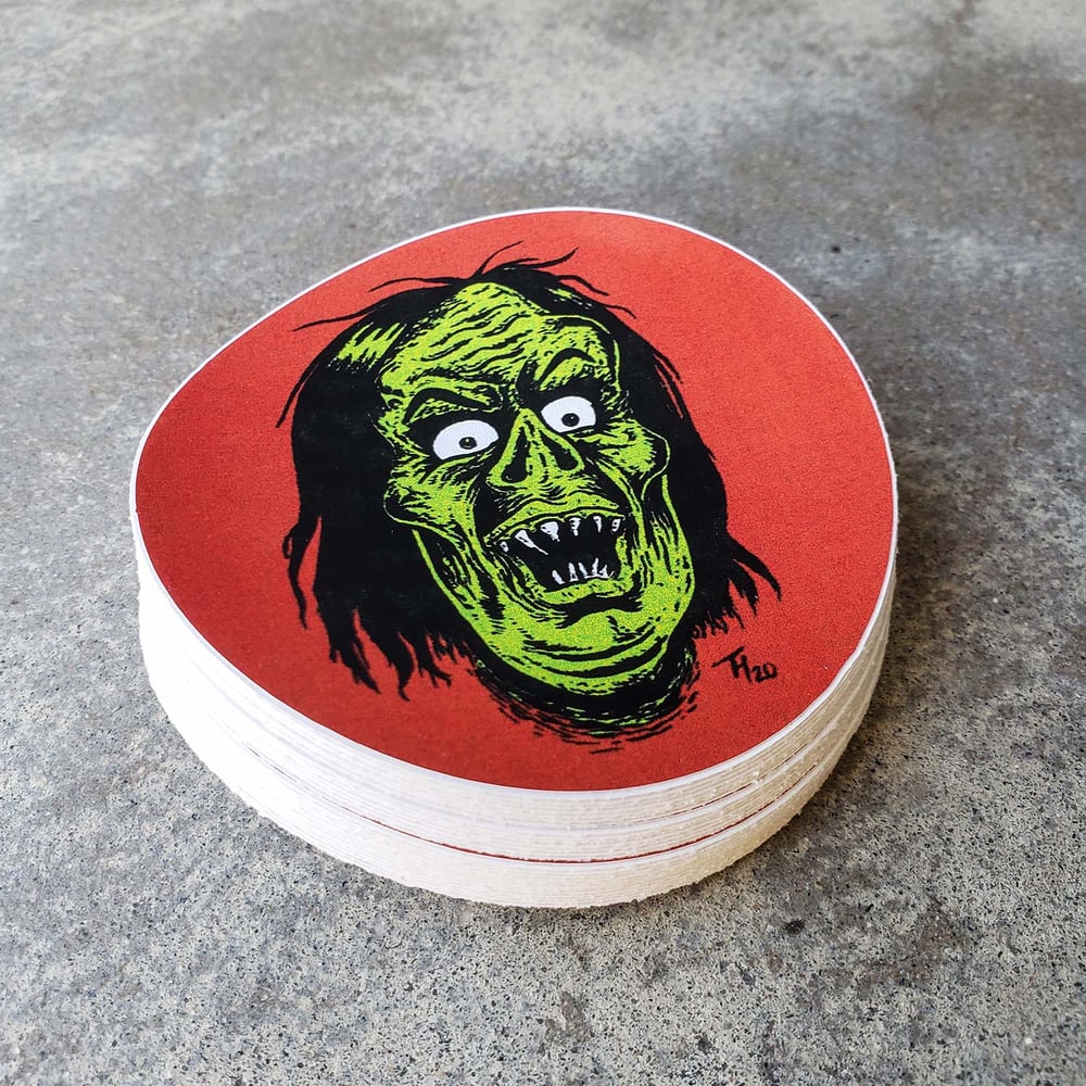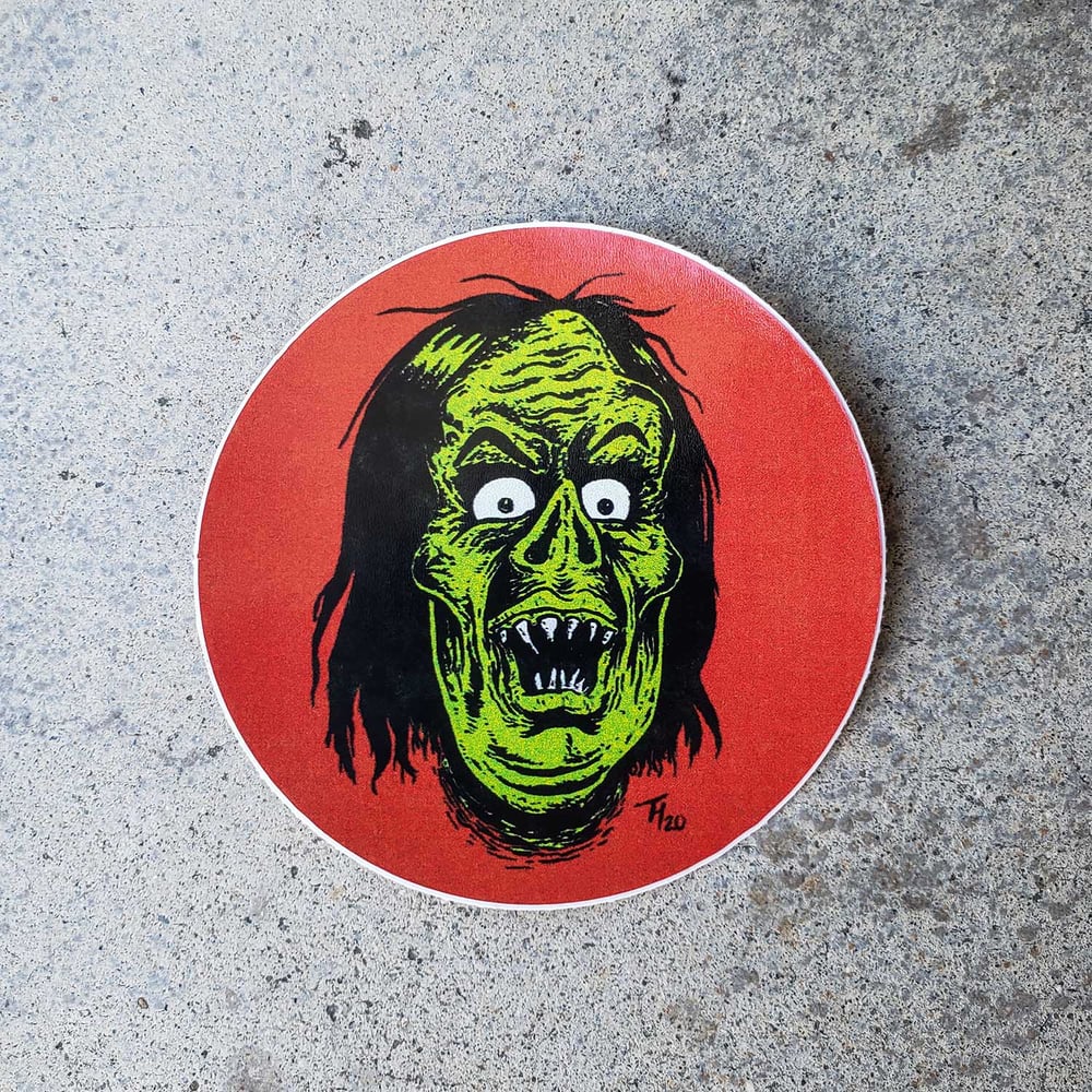 Green ghastly ghoul illustration over a red background on a 3" round sticker is durable and has UV protection to help it last outdoors. Available as a single sticker, (buy two get one free) 3 pack, or included in the "Pure Haight" sticker combo pack that includes every sticker I have! This design is also available on shirts for a limited time. Thanks for lookin'!