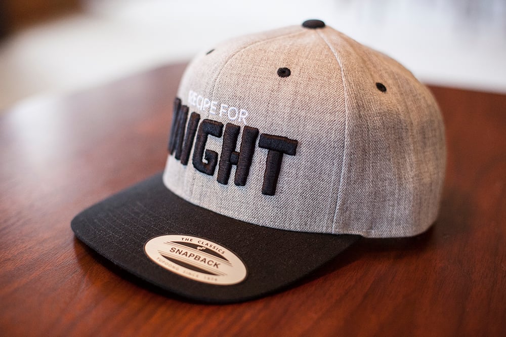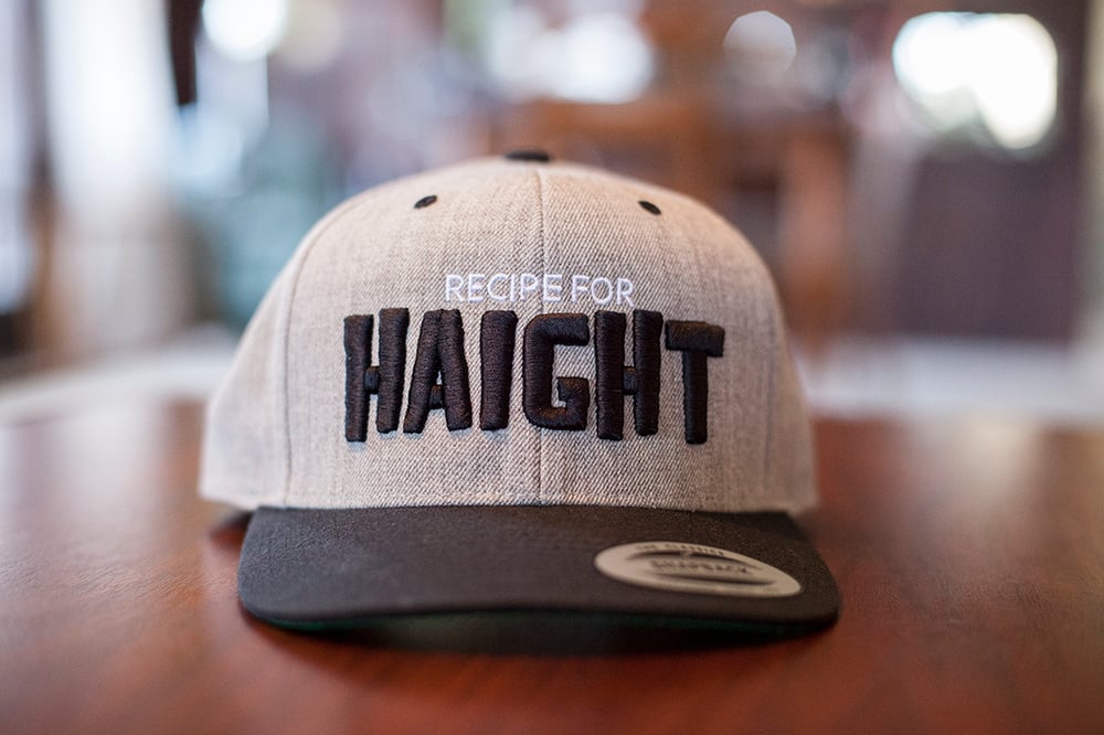 'Recipe For Haight' custom embroidered premium wool blend snapback baseball cap in heather grey/black. The 'Recipe For' text is standard white embroidery, and the 'HAIGHT' text is the fancy 3D puffy embroidery in black. Available for a limited time. Get it while the gettin's good!